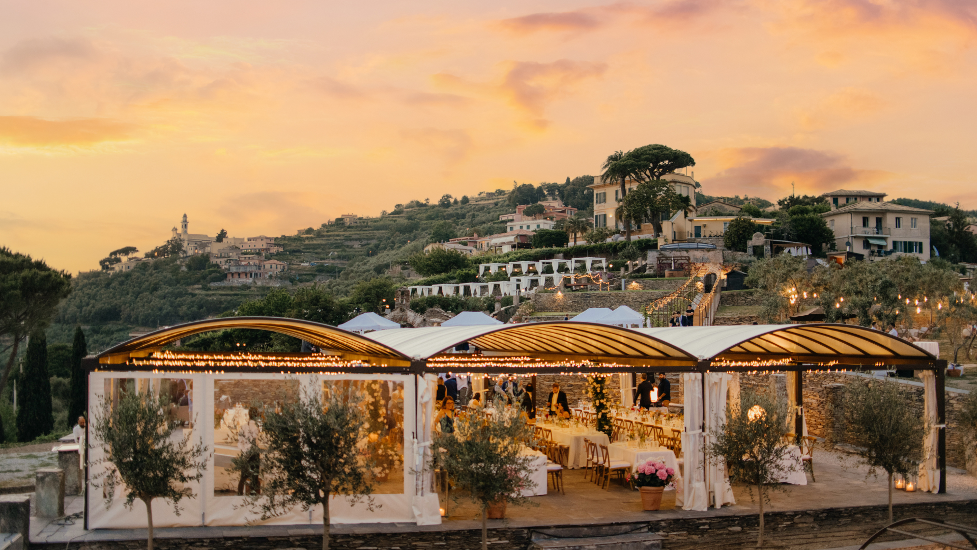 Villa Riviera Resort can accommodate up to 150 guests. Wedding banquets are typically hosted on our expansive 225-square-meter terrace, elegantly sheltered by a sophisticated marquee. For more intimate gatherings or after-midnight celebrations, we offer the refined dining room of Villa 800 (seating up to 40 guests), alongside a picturesque olive grove and two panoramic terraces overlooking the Gulf of Portofino.